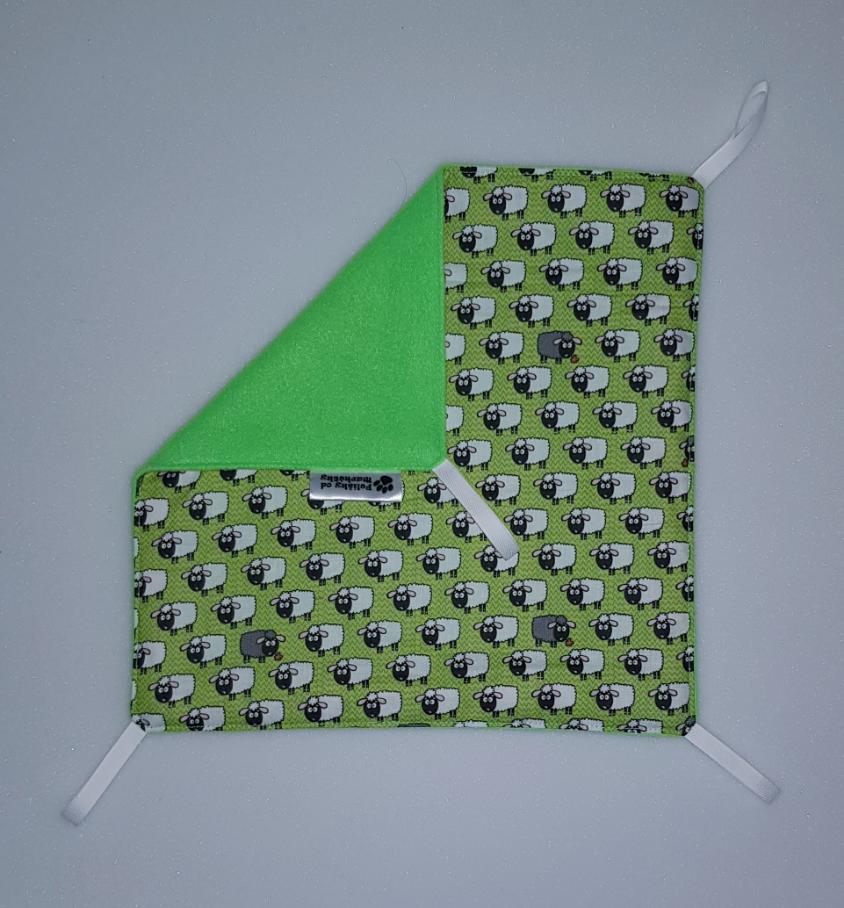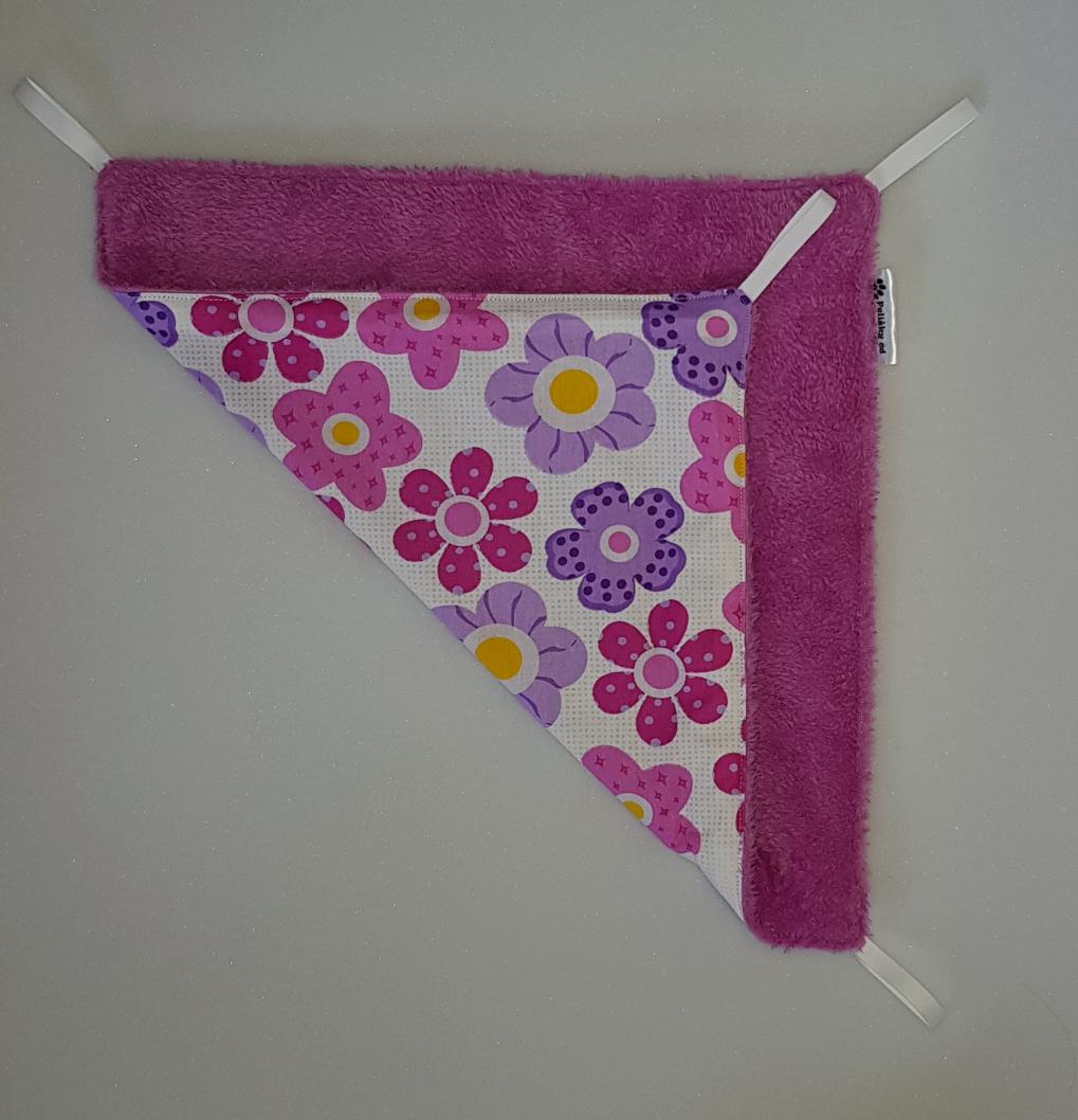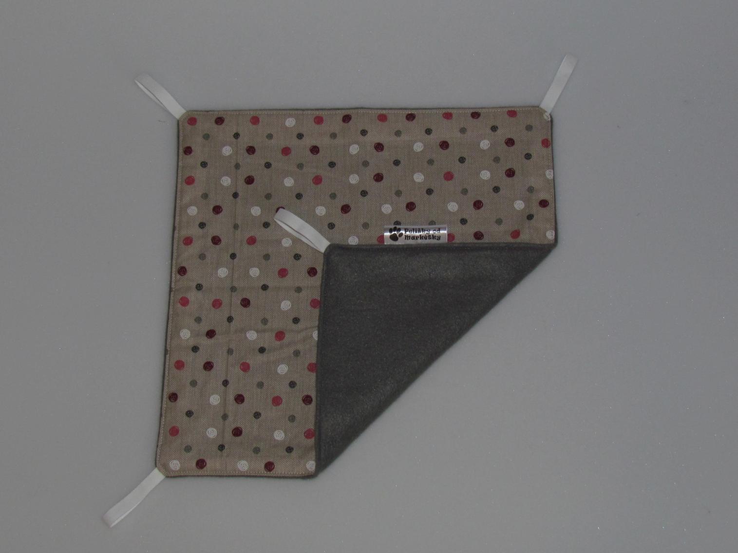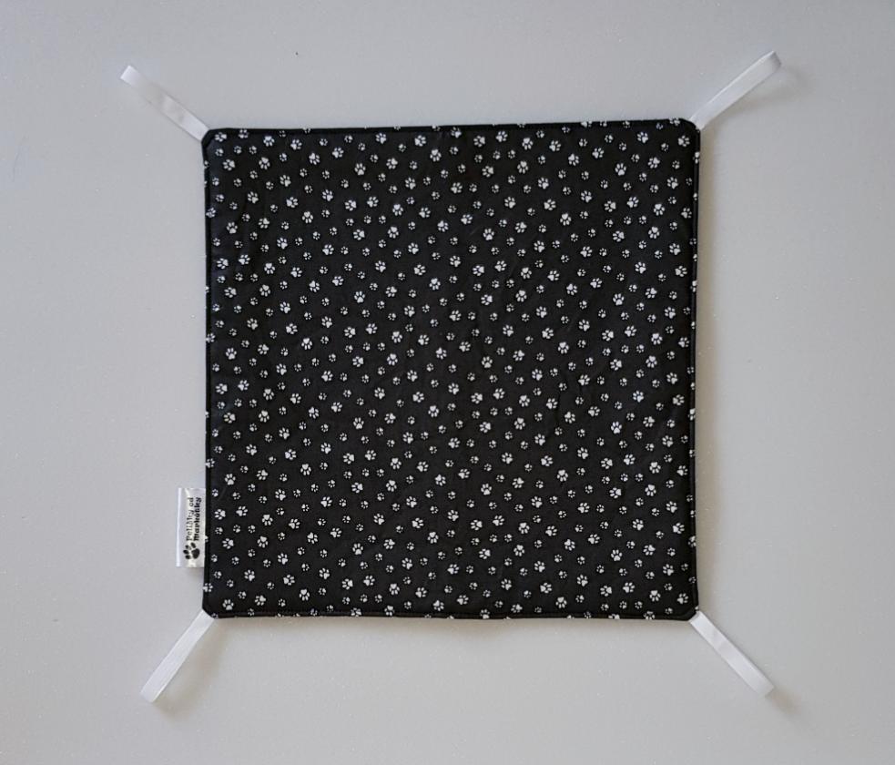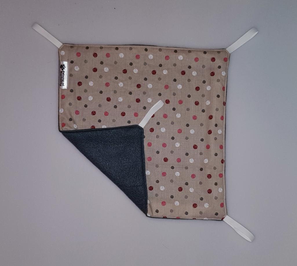 Závěsný pelíšek v provedení hamaky. Lze připevnit v kleci či k přepravce pomocí poutek umístěných v rozích pelíšku.