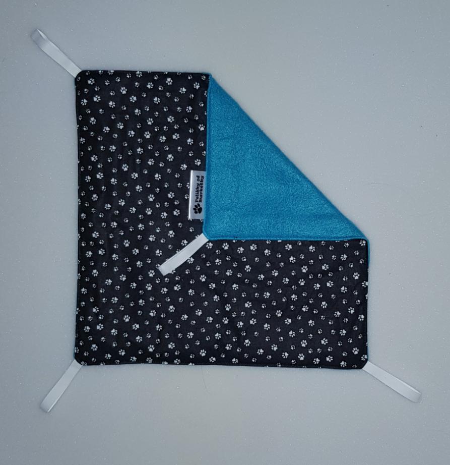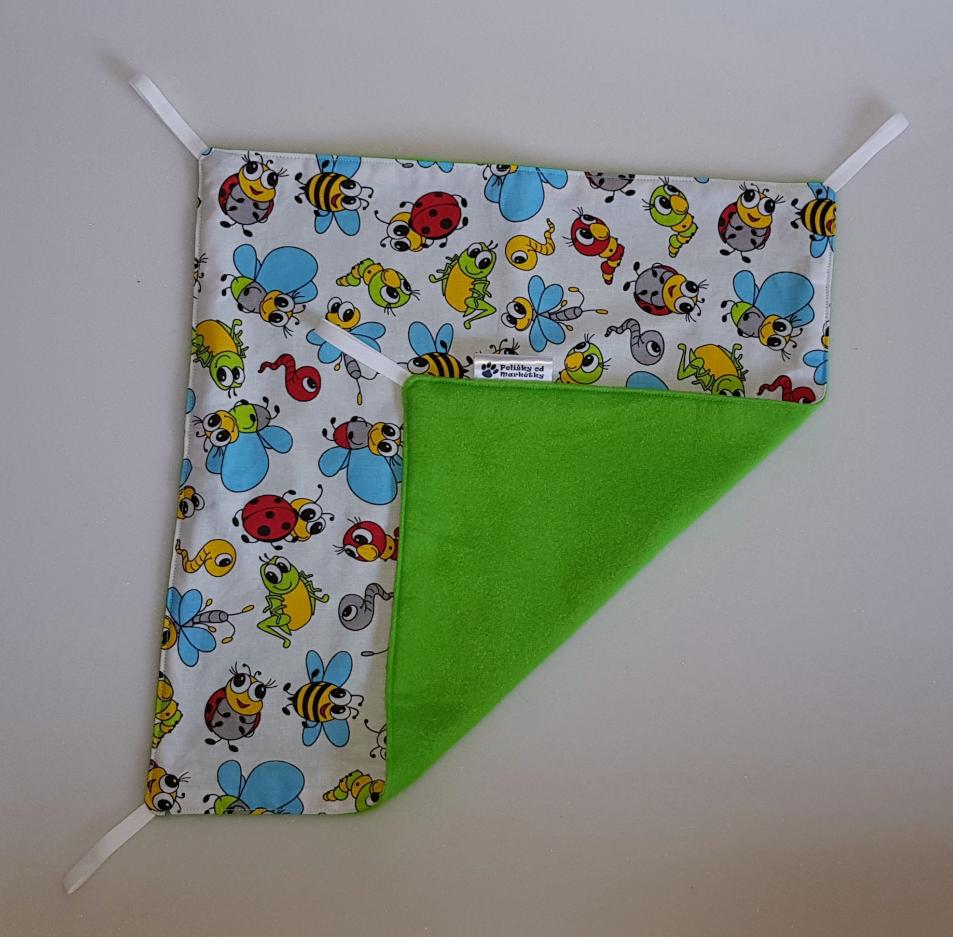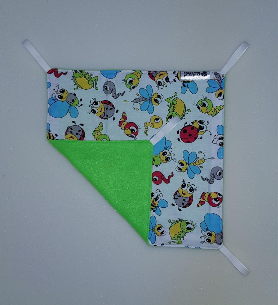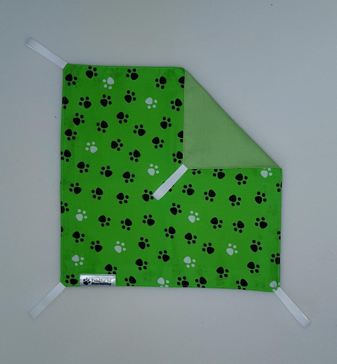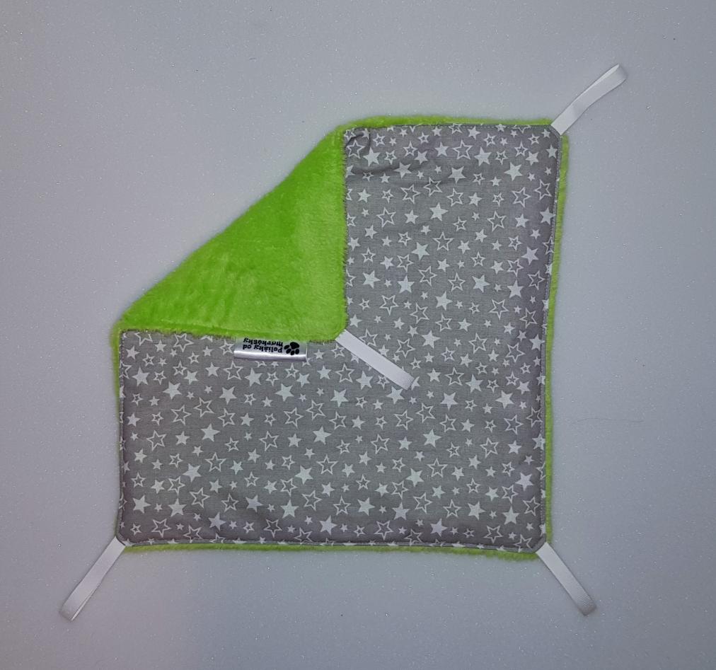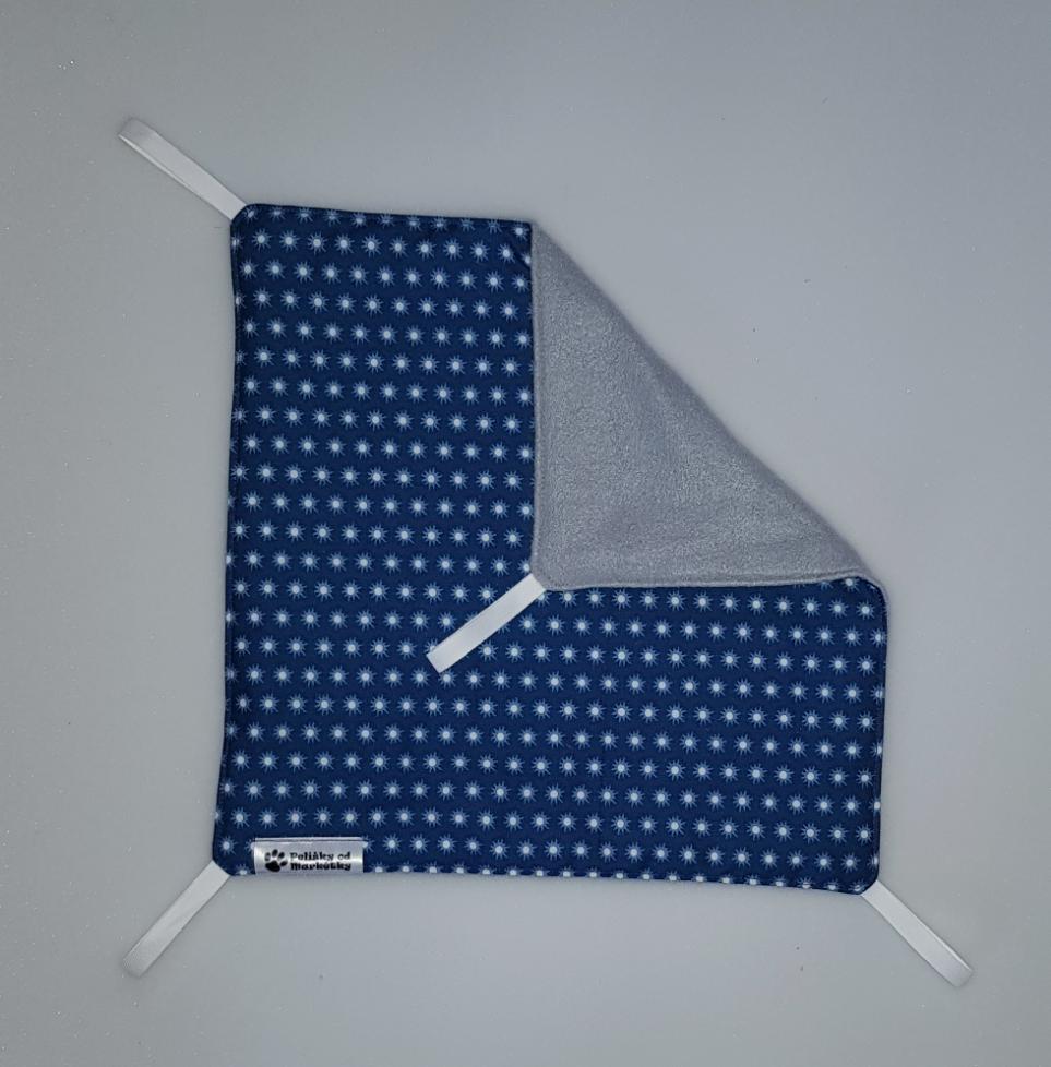 Závěsný pelíšek v provedení hamaky. Lze připevnit v kleci či k přepravce pomocí poutek umístěných v rozích pelíšku.