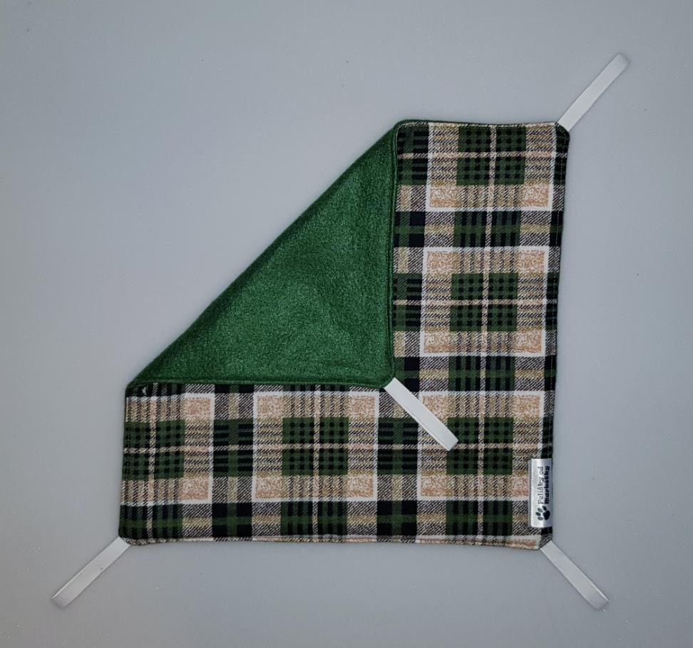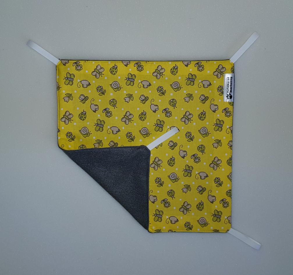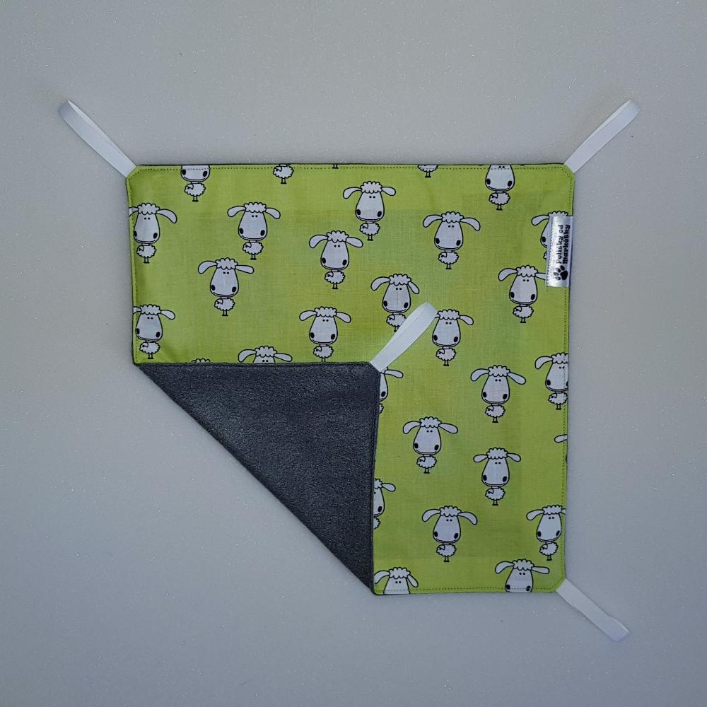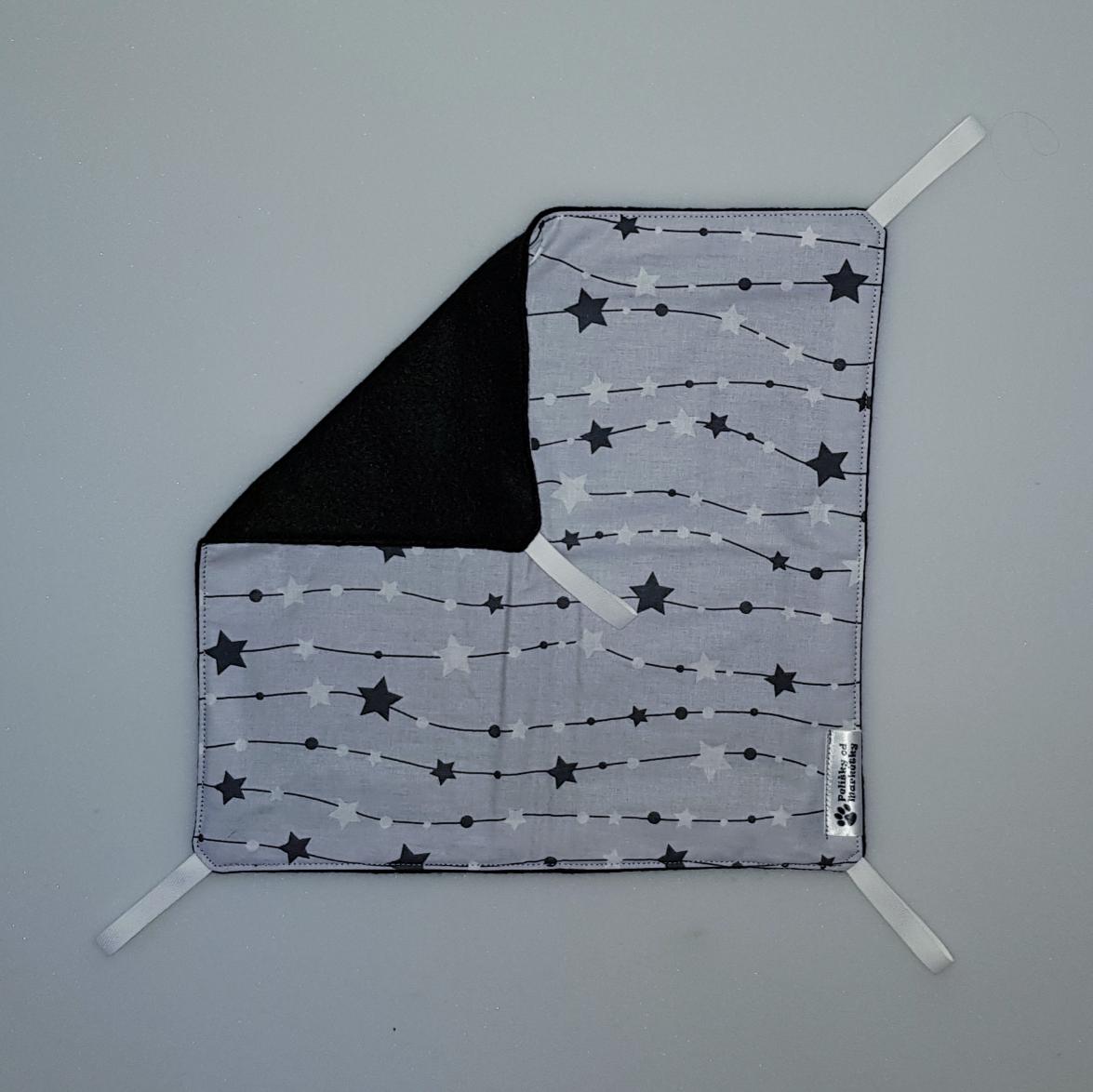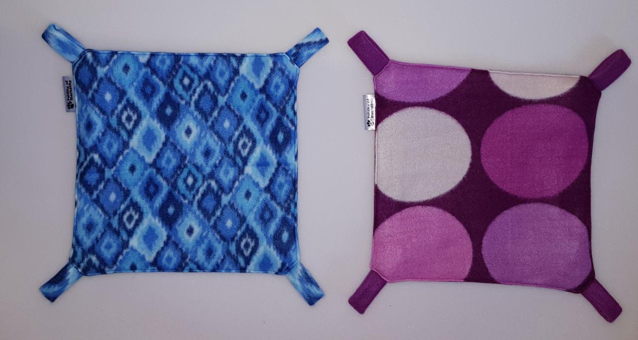 Závěsný pelíšek v provedení hamaky. Lze připevnit v kleci či k přepravce pomocí poutek umístěných v rozích pelíšku.